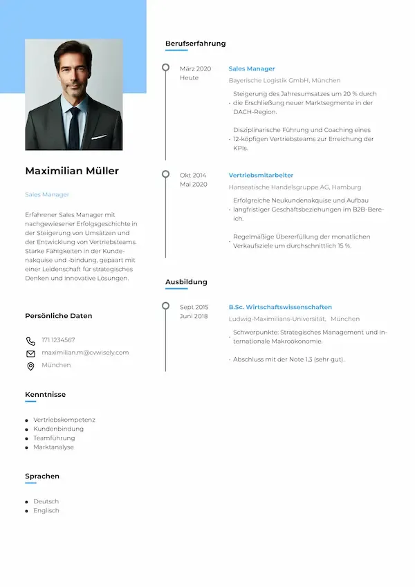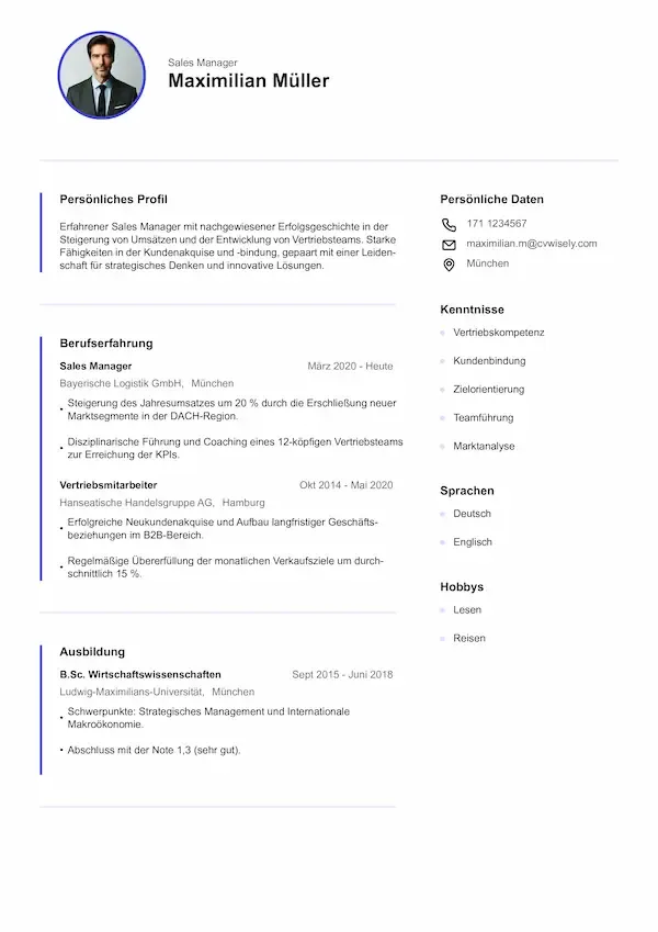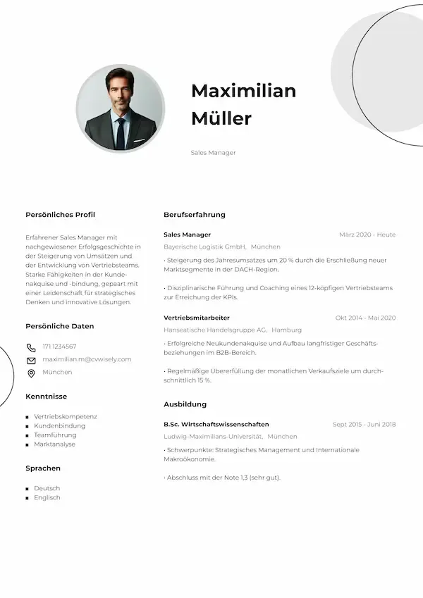 Professionelles Lebenslauf-Muster mit dezenten Farbakzenten und einem gut lesbaren, strukturierten Format.