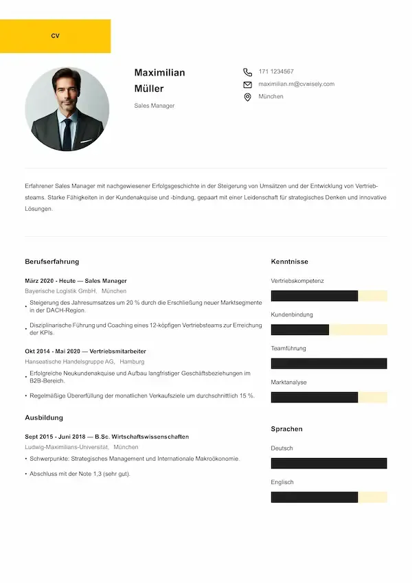 • Übersichtlicher Kopfbereich mit Kontaktdaten und Platz für ein professionelles Porträtfoto