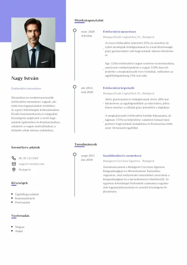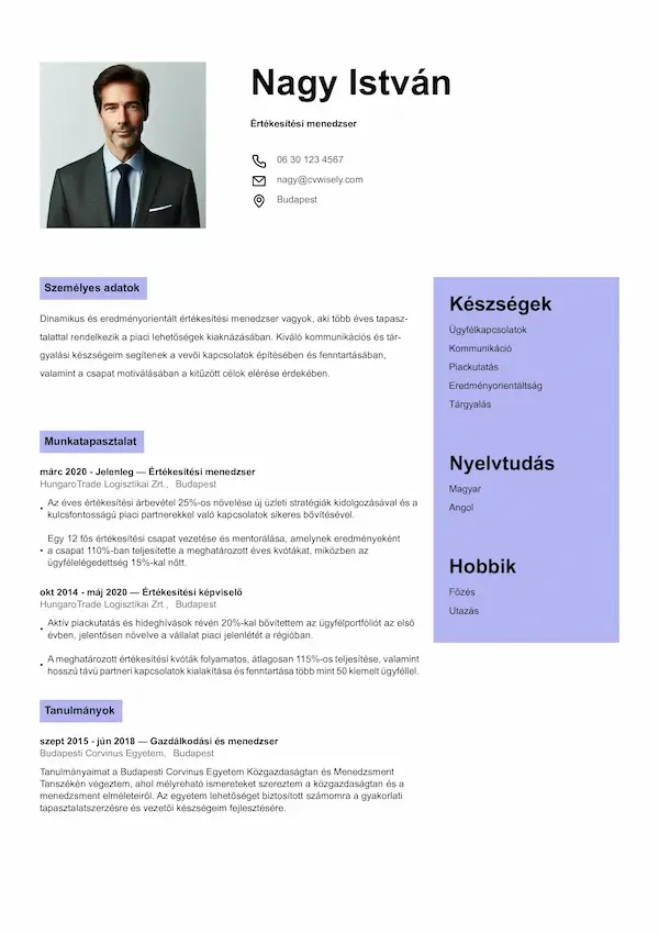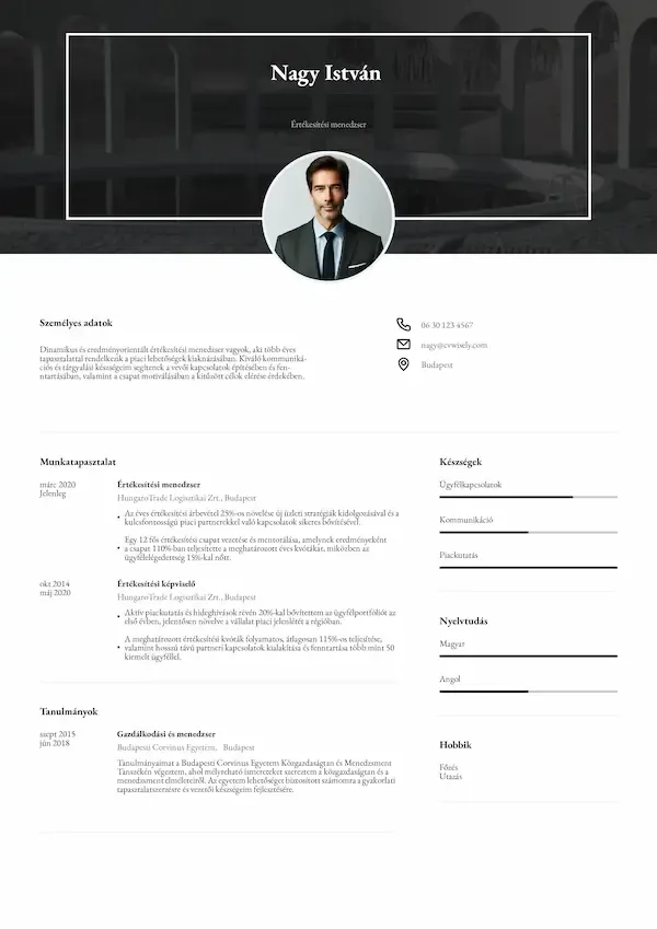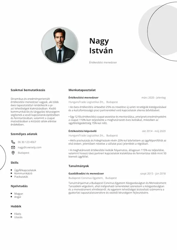 Professzionális önéletrajz minta stílusos részletekkel és jól olvasható, letisztult formátummal.