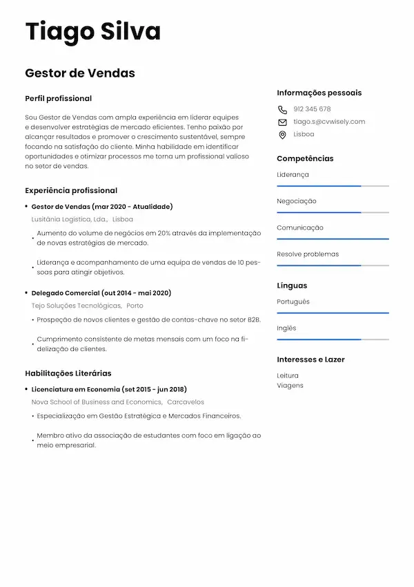 Modelo de CV clássico com foco no resumo profissional, competências e experiência laboral.