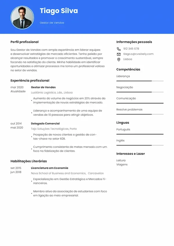 • Seção de cabeçalho clara com detalhes de contacto e espaço para foto profissional